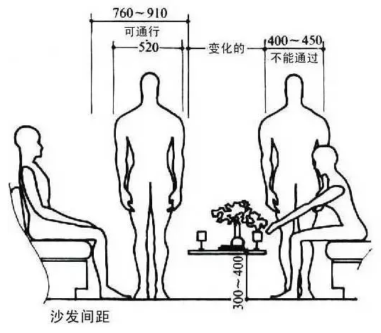 当沙发上坐人时,其他人若能正常通行,那么茶几与沙发较为适宜的距离为 760-910mm。