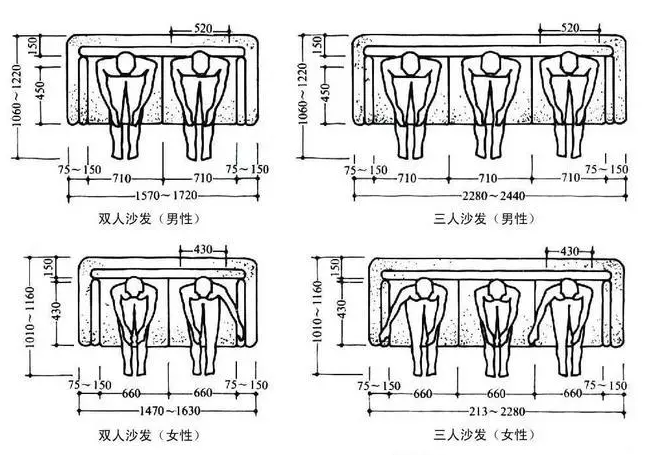 以男性为例,双人沙发通常的宽度在 1570mm-1720mm,三人沙发则是 2280mm-2440mm。但具体尺寸要考虑家人的实际情况。