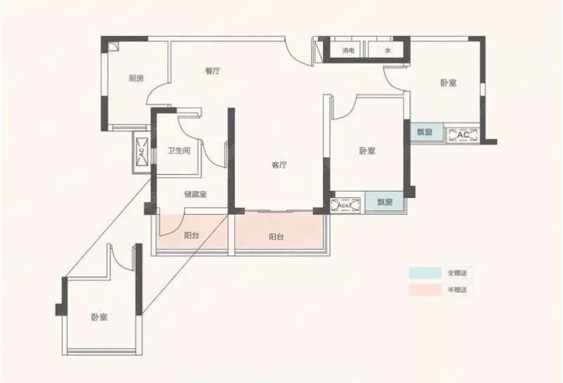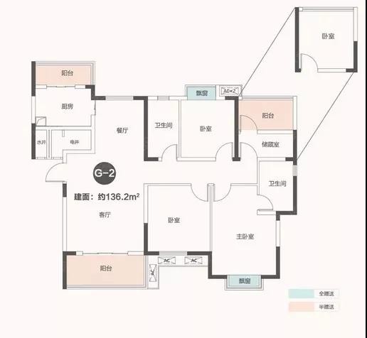 2.厨房外洗晾阳台布局不合理,厨房面积比小,需注意油烟问题。
