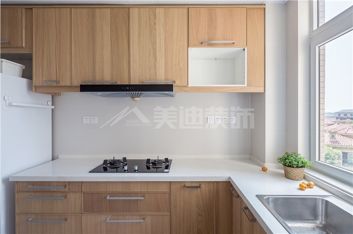 开放式的设计是打开厨房整体视觉空间的最好方法,去掉了厨房与客厅之间的一墙之隔,不仅拉近了人与人之间的距离,营造出一种温馨的家庭氛围,同时也给家中带来了一种通透的视觉环境,去除了墙壁的阻挡,进一步加大了纵深。