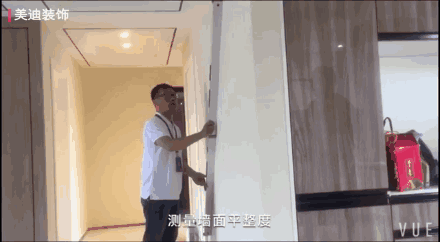 美迪监理钟玉林正在进行墙面垂直平整度检查,他说墙角偏差与墙面垂直平整度这两项指标除了能体现房子墙面的外观美感,还能检查出墙面的结构是否有问题。
