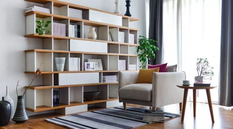 比如可以利用电视墙和门后墙等墙体的上层空间做收纳柜或置物架,也可以选择将收纳和展示的空间做成一整面墙,充分解决小户型的收纳难题。