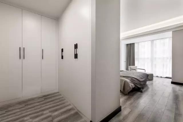 主卫的通道,甚至是卫生间原本的干区,都可以改造利用起来,把主卫门外的两侧装成步入式衣帽间,这样利用也是不错的选择。