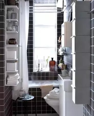 8.在这个小空间中,挤下了一个卫生间里所有的功能区,小型浴缸、细窄墙面储物柜、窗户带来的明亮采光,让这个空间显得不那么拥挤。色彩和灯光是两大利器:如果你的卫生间很小预算也不多,那请你一定要善用色彩和灯光这两件东西。