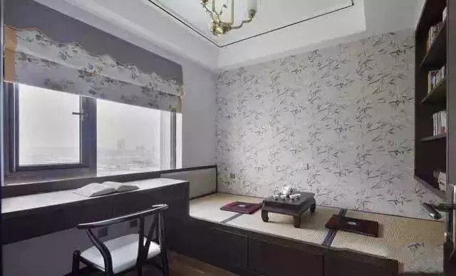 书房、榻榻米休闲空间,私密性低一点,所以一般书房可以使用通透百叶帘,如果是书房兼次卧就选择私密性好一点的布帘。上图碎花罗马帘与背景壁纸呼应