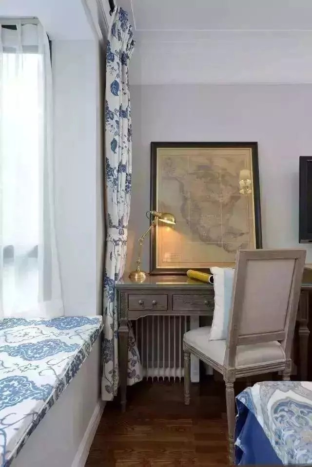 很明显,上面搭配的窗帘与床品以及飘窗垫都是呼应的,很整体,但是提醒各位业主,太花的布料要慎用,特别是在空间较小的房间,花布的颜色也要有所考究