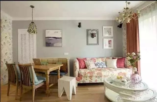 田园装修,窗帘与沙发碎花以及卡座抱枕呼应,这个风格的选择要非常慎重