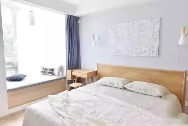 淡蓝色墙体,假飘窗收纳和墙围都是浅色木饰面,显得沉闷,于是苹果绿的暖色窗帘就是一种点缀。这里不要求呼应了,可以用自己喜欢的颜色直接跳跃设计
