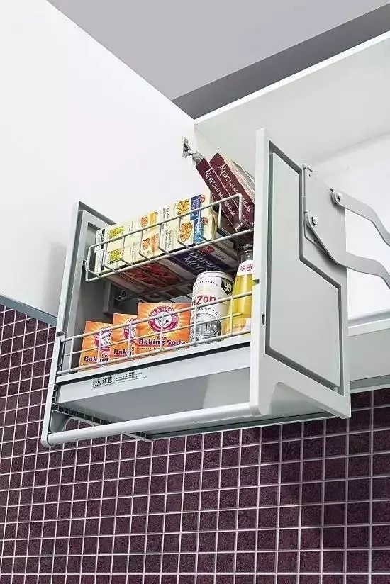 上方的吊柜,由于身高有限,做成下拉式的,可自由上升,方便拿取,空间也充分利用到了;