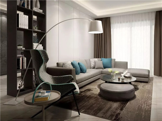 经典的黑白灰家居,看起来就很高级。地毯也延续了这份经典,三色的渐变让家居色块承接得恰到好处,与金属质感的钓鱼灯搭档,赋予家居新的时尚品味。