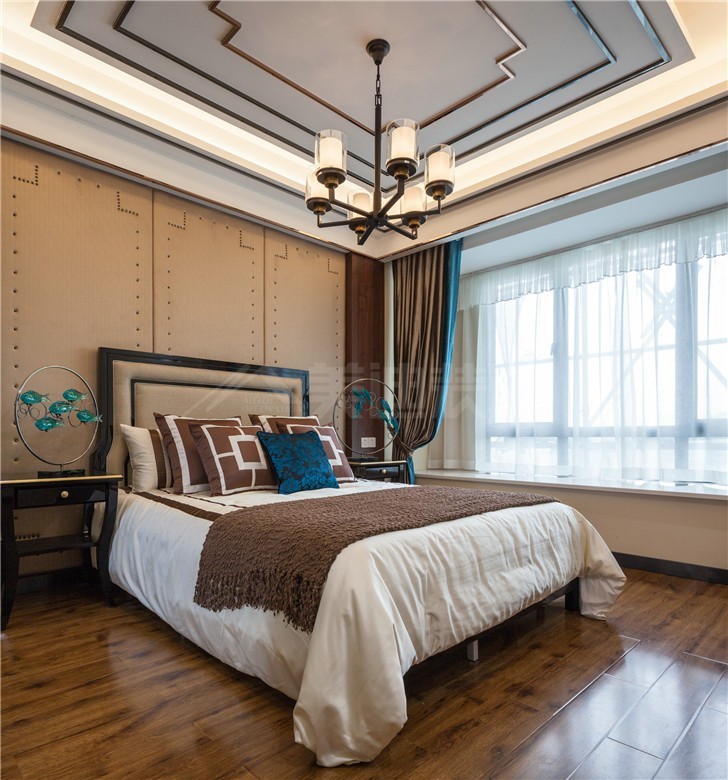 创新性的设计融于设计的各个角落,更加展现了空间中创意十足的设计感,加上一些充满简约质感的家具设计,让空间凸显出一种淡雅的贵气,简单时尚的设计就像是一处在浮华尘世中的以安身立命的一处净土。在这套新中式装修设计风格之中,虽然运用中式家装设计的精髓设计,但是其色彩要较传统中式更加清秀,摒弃其厚重的历史感,继承其精彩的文化底蕴,用独具特色的意境设计手法,将卧室设计的高雅复古,却又具有简约素净的精神,让人更能感受到生活中静谧的魅力。