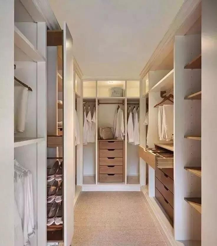 狭长的空间可以选择一字型布局,为中间的行走与换衣空间留出足够的距离。