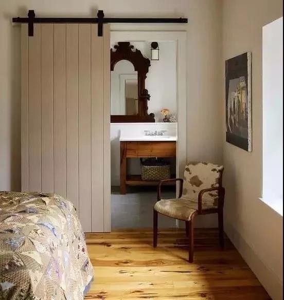 通过滑轨和轮滑在门洞上做出的外露推拉门,其质朴又酷酷的外表让人深爱不已,在客厅与卧室的过渡区有一扇谷仓门,关闭就是一面酷酷的墙,美观又省钱。
