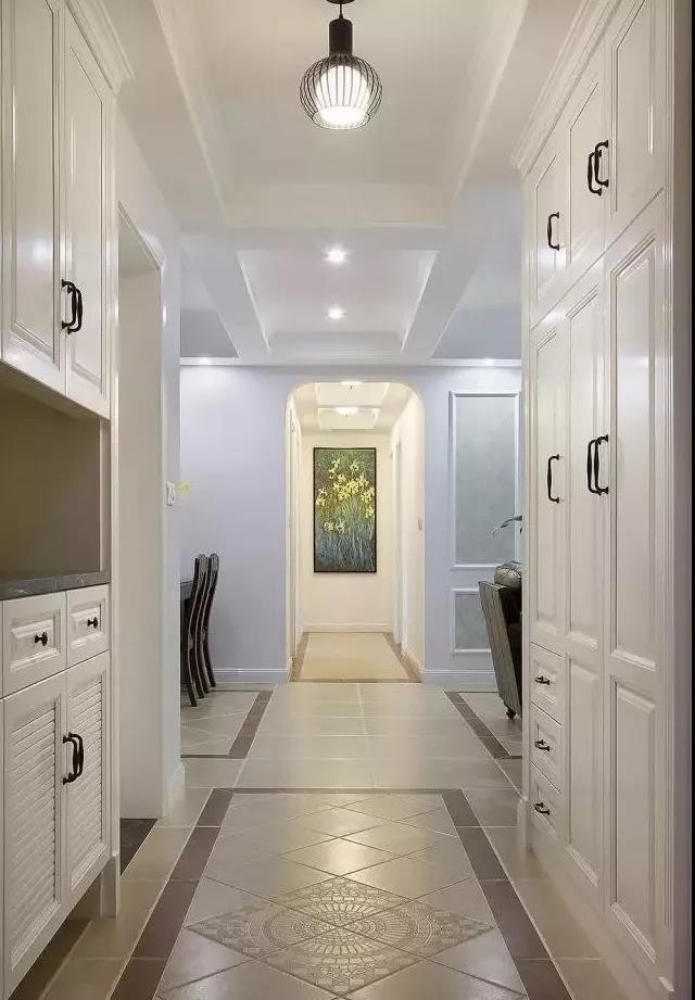 通道式玄关都是偏狭长的,可以放置鞋柜、收纳柜等延展空间,增强玄关实用性,入户空间看起来清爽又利落。