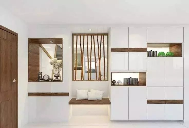 嵌入式壁柜是节省空间的利器,它的外观简约大气,内部收纳空间也很充足,你可以设计成半开放+半封闭的形式,让换鞋凳和收纳区融为一体,整个门厅就不会显得又挤又乱了。