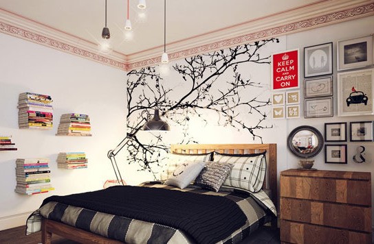卧室床头吊灯不仅能解放出床头柜面上的空间,如果设计别致,还能提升卧室格调。那些别致的床头吊灯,它们或妩媚或阳刚、或可爱或充满创意,而卧室也随着不一样的吊灯展现出不一样的情调。这个床头风景的设计结合了很多的自然元素,以树状做床头柜,以竹篱笆装饰墙头墙面,清新自然。