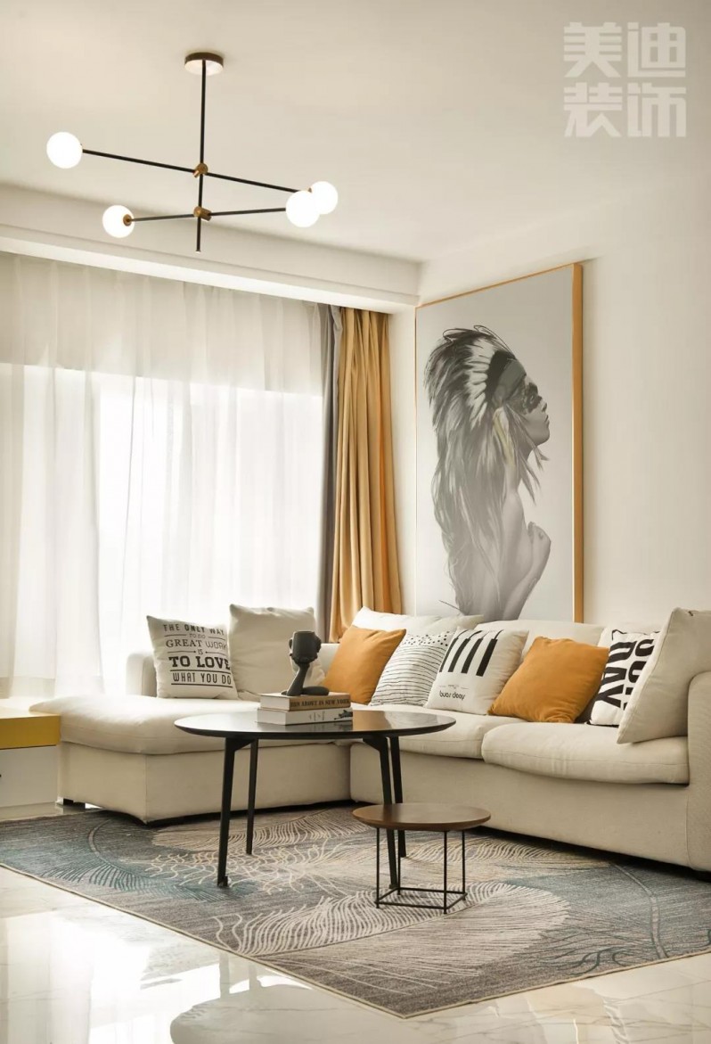 客厅线条流畅简洁,增加了黄色这一跳跃的颜色,抱枕、窗帘等细节均有体现,让空间更佳明亮。黄色作为鲜明程度最高的色彩,带给人轻快、充满活力的印象。