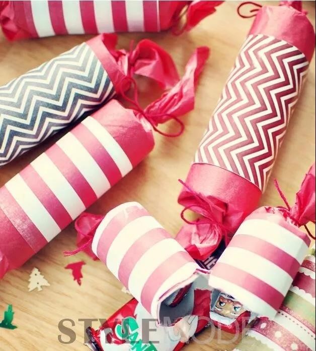 材料:厕纸芯筒、剪刀、礼物包装纸、胶水(双面胶)、细麻绳