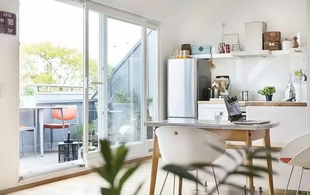 打掉隔墙(非承重墙),以具有储藏功能的收纳柜来分隔空间。