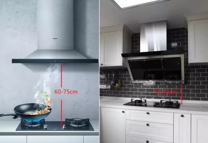 这里讲一下油烟机离灶台高度,顶吸式安装高度在距离灶台的65-75cm间;而侧吸式油烟机底部距离灶台距离可以更近,一般在35-45cm间。