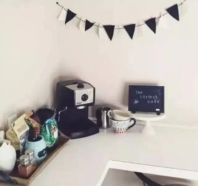 △小黑板作为装饰品,是咖啡角must have装饰清单中的第一位,可留言做提醒,也可以画些喜欢的图案在上面,全凭自己发挥~
