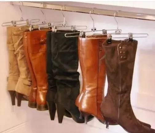 大多数的家居生活都无法像明星的衣橱空间大,很难做到尽情展示自己的战利品。充分利用空间成为了关键。像高靴就可以用收纳袋悬挂起来,方便整洁。同时,也可用带有夹子的衣架将其夹紧悬挂起来。
