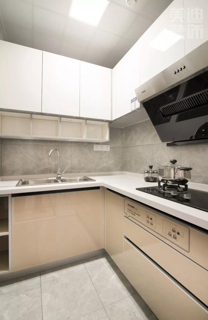 厨房同样是舒适的色调,功能台合理区分,收纳功能满级,再也不用担心家用物品无处安放,只能扔扔扔了。
