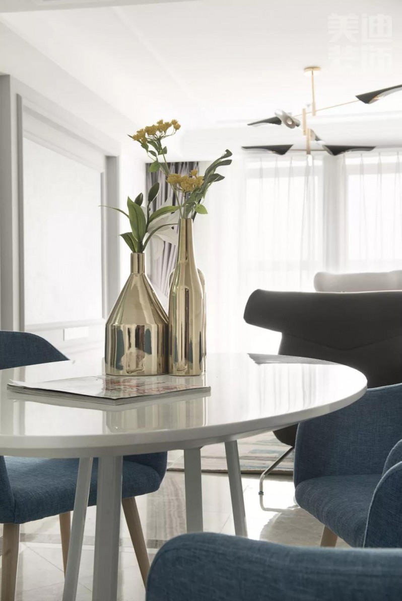 客餐厅采用开放式设计,空间的整体视觉和采光都得到大幅提升。餐桌上的金属花瓶搭配花束,在素雅的窗帘衬托下,增添了一丝优雅韵味。