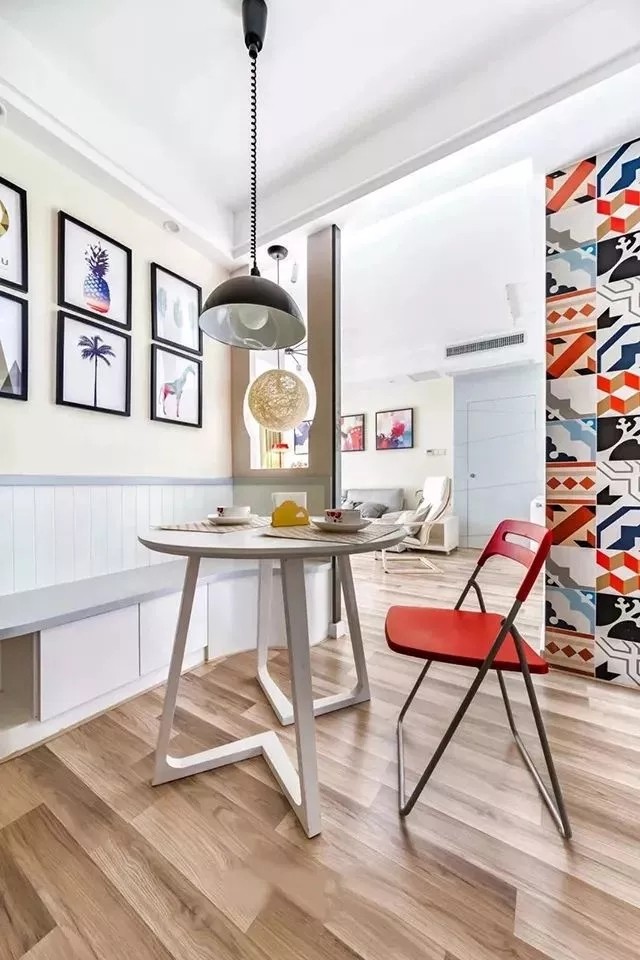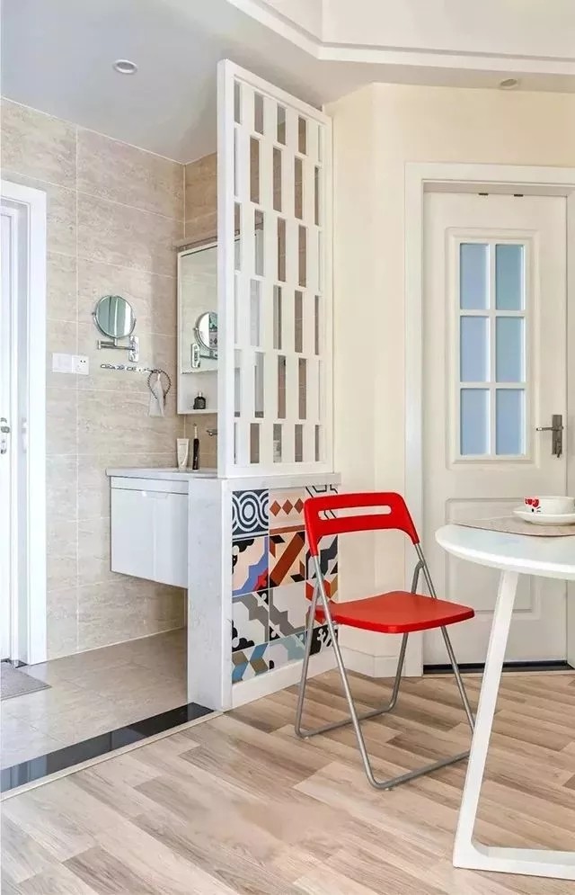 餐厅与洗手盆之间的墙面贴的彩色花砖,结合一款镂空隔断,使空间更加通透。