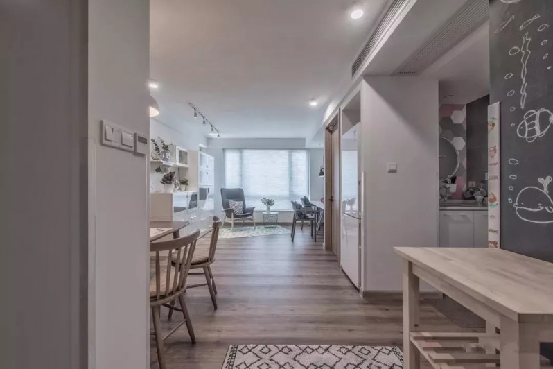 原始户型开门见厅,设计师在正对门的位置安装了一道白色储物柜,隔绝视线的同时,提高了空间的储物能力。