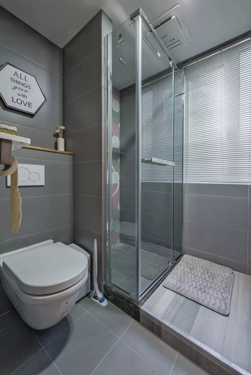 淋浴区,六边形拼色瓷砖与干区呼应,墙排马桶上方加入木面置物台。