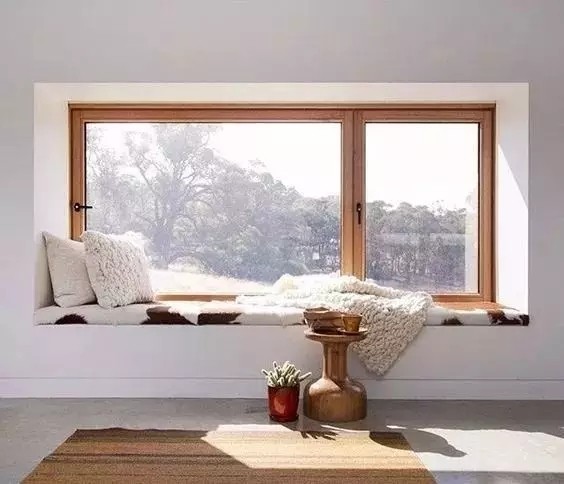 如果房间空间比较小,不妨可以利用飘窗的这个位置,来增加一个书桌的位置,当你长时间对着电脑工作,眼睛疲惫时,只要抬头,就能看见外头的青草绿树。