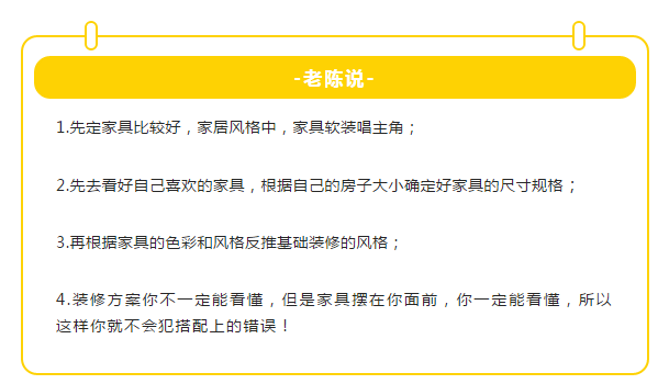 想必大家看完老陈的视频后,对先定装修还是先定家具的问题有了清晰的认识,先定装修有弊端,而先定家具优势多多。如果你还在纠结,请往下看!