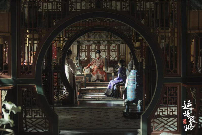 长春宫使用大量紫檀木,镶嵌白玉、墨玉、青玉点缀,酒红色万字纹墙纸,明黄色幔帐、流苏等将场景的大色调锁定,以此突出富察皇后的高贵地位以及温和善良的性格