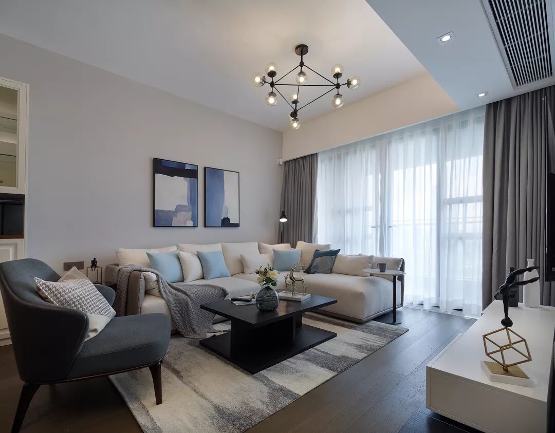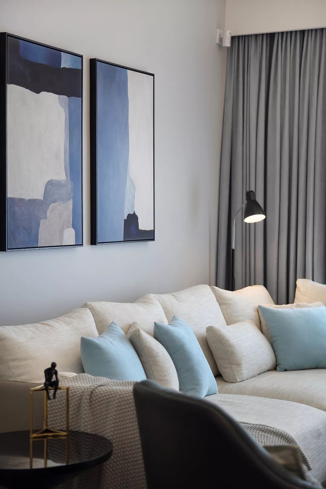 客厅是极简的现代风格:简单的几何形吊灯、干净留白的墙壁、温润木质的地板配上水墨画一样的地毯、点缀蓝色抱枕的米色沙发、还有那欲说还休的壁画。