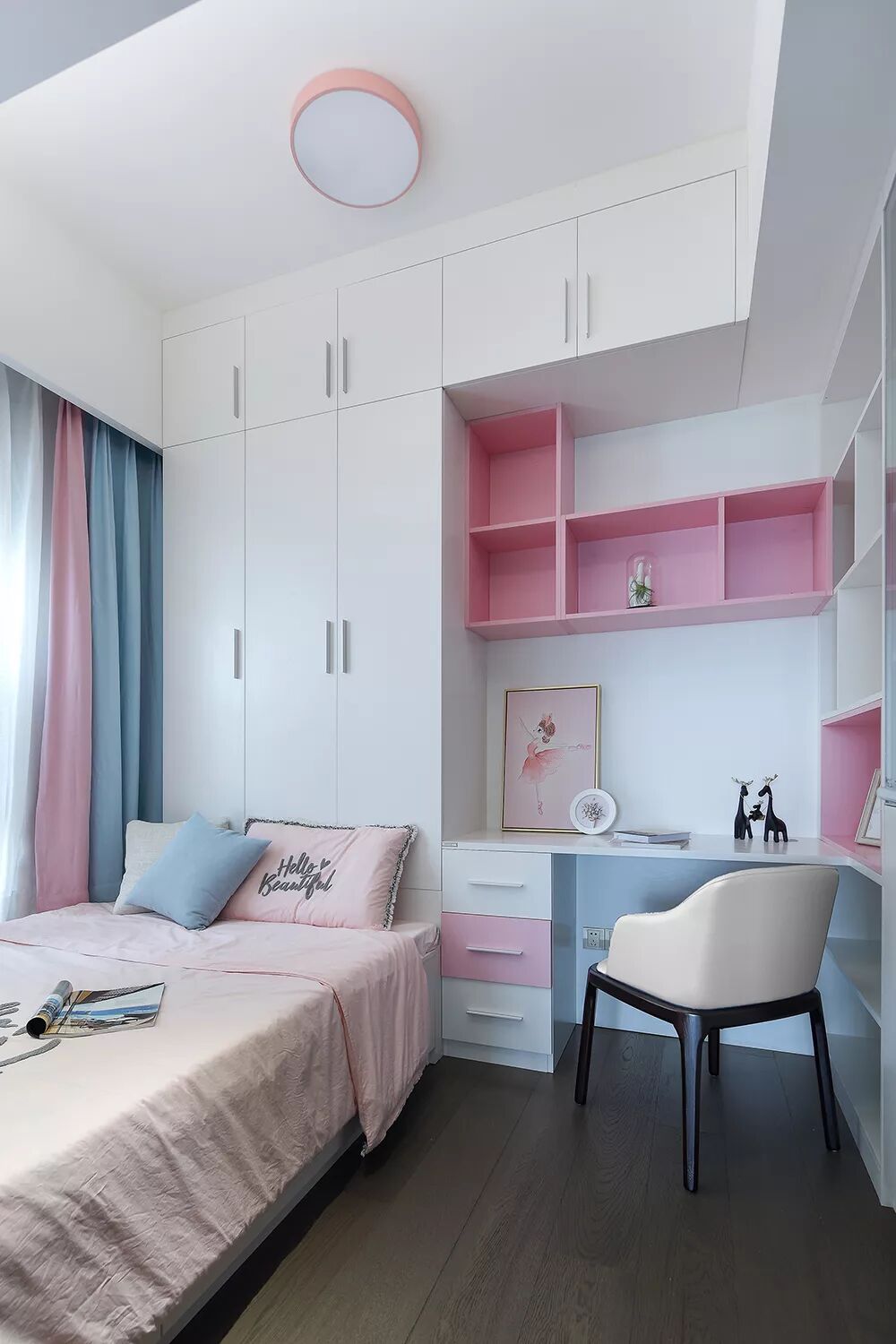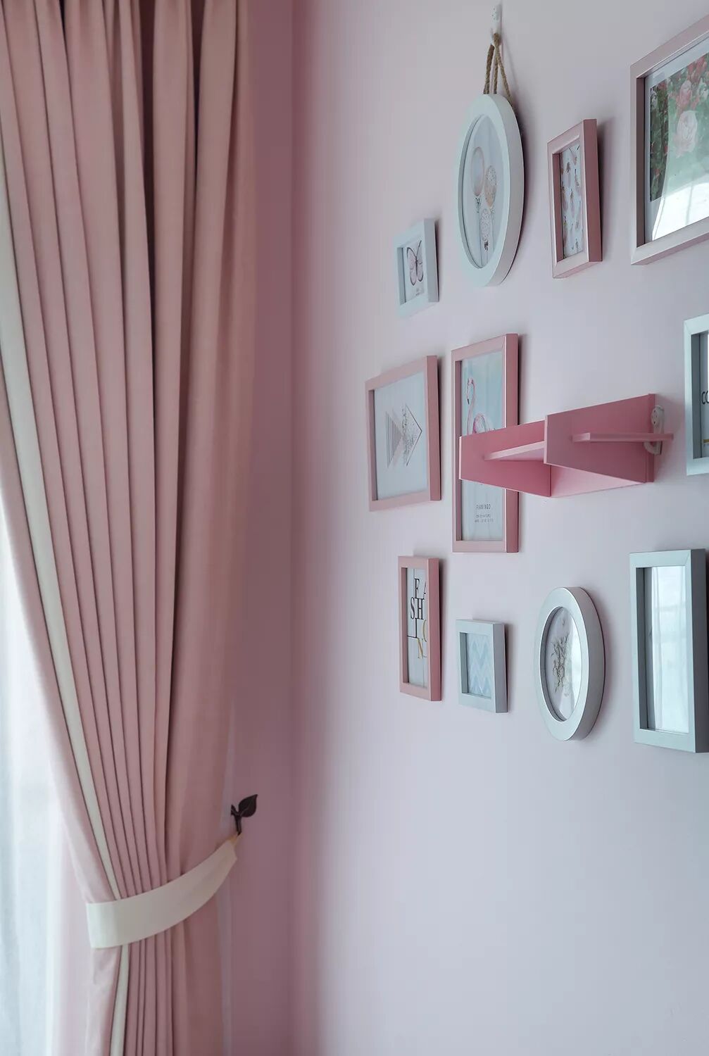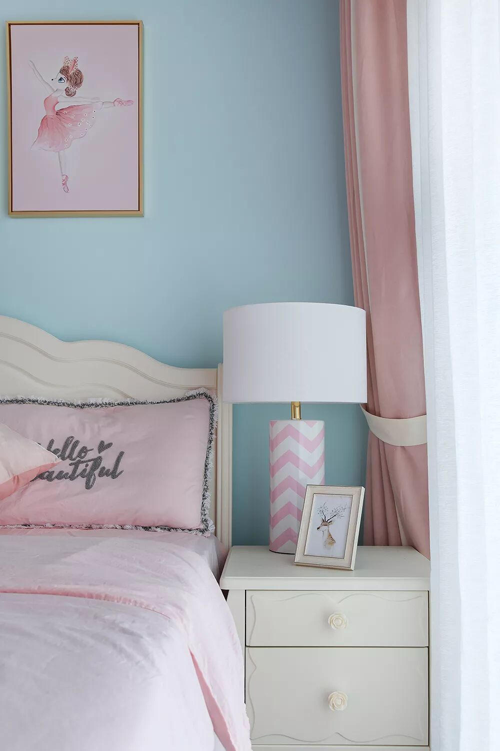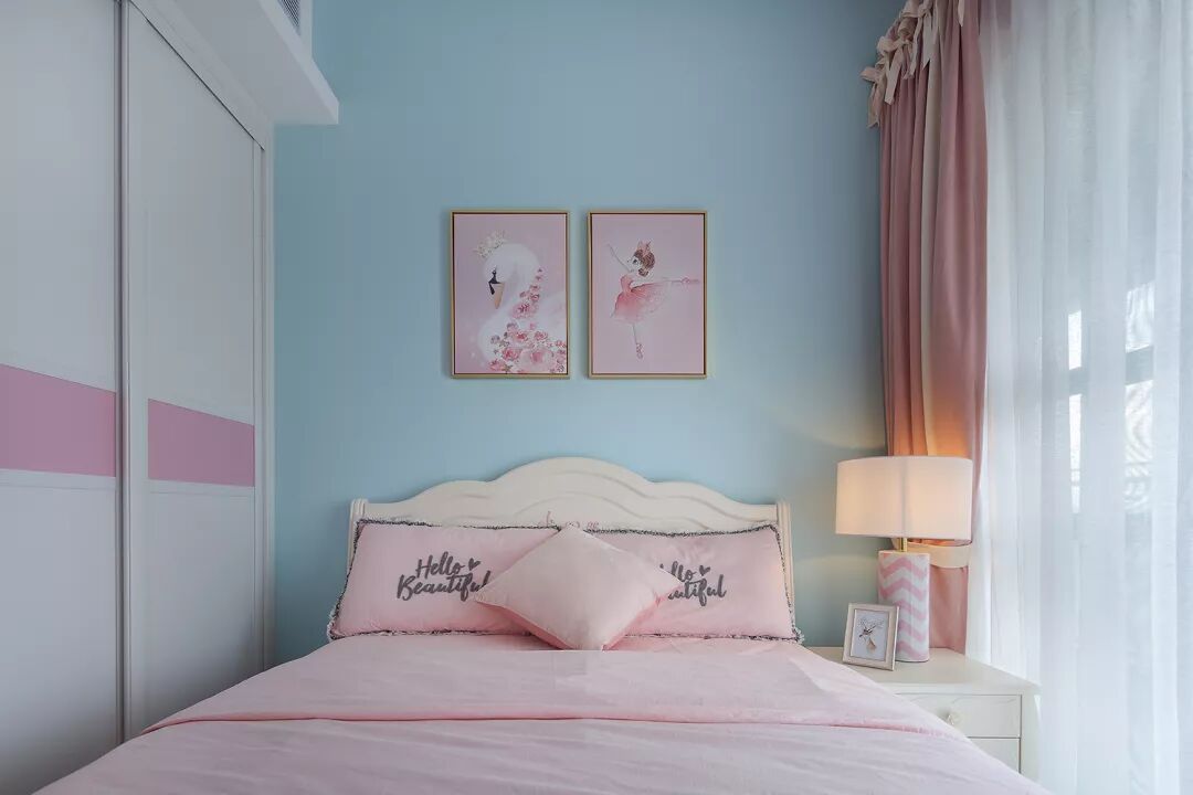 儿童房也做了精心布置,粉红天蓝的搭配让整个房间显得明亮又清新,几何体造型穿插在空间里,简洁又大方。