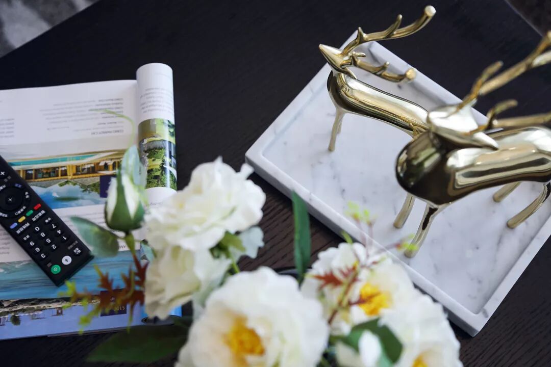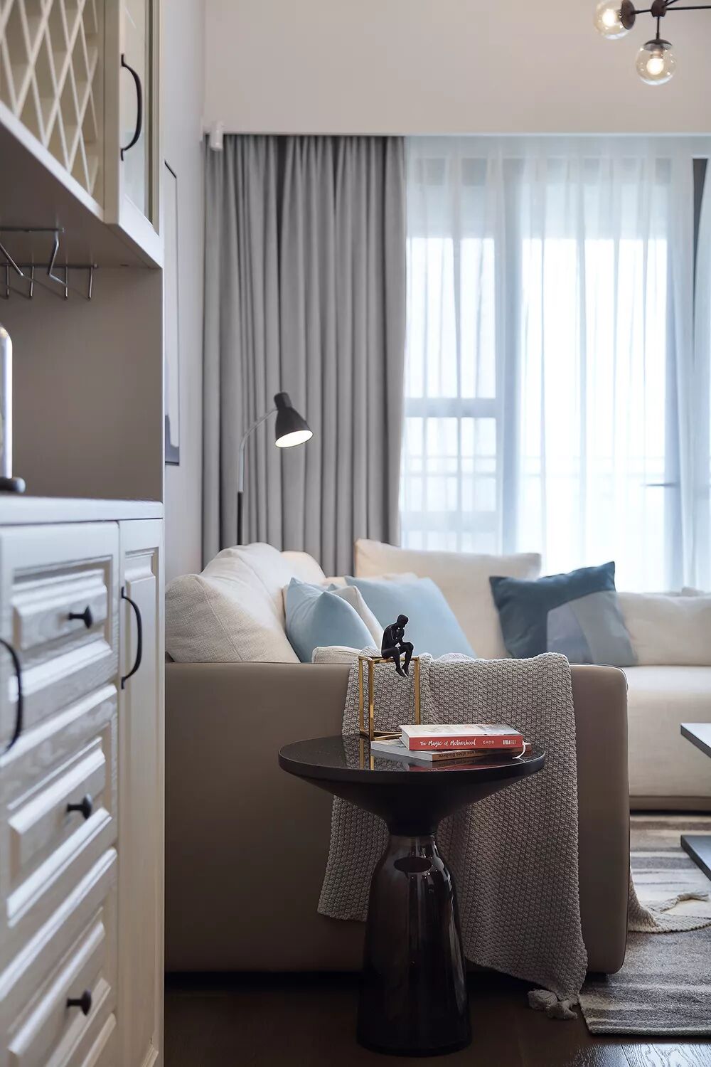沙发旁造型独特的案几,工字型的茶几,墨色底的电视柜,搭配几个让人耳目一新的小物件,简单又美观,用来招待三五好友享受静谧的下午时光也真真是极好。