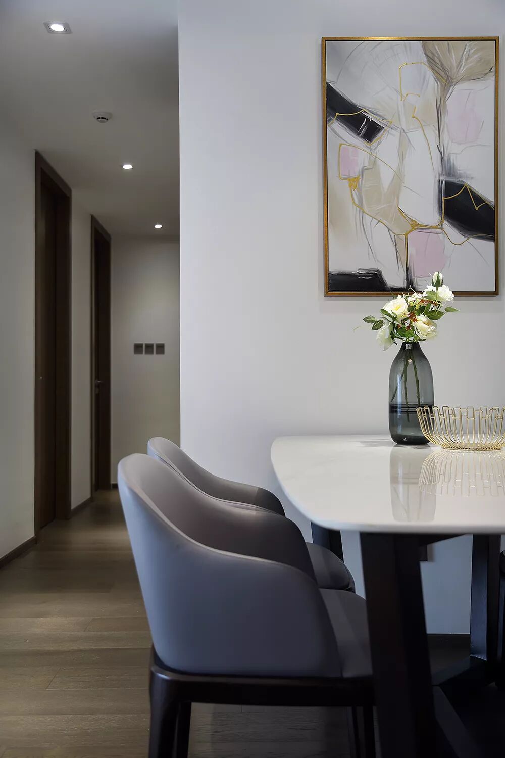 素雅的鲜花为简约的餐桌添上一抹愉悦的生活气息,恰到好处的壁画为餐厅增添一种层次感,和谐而美好。