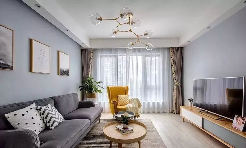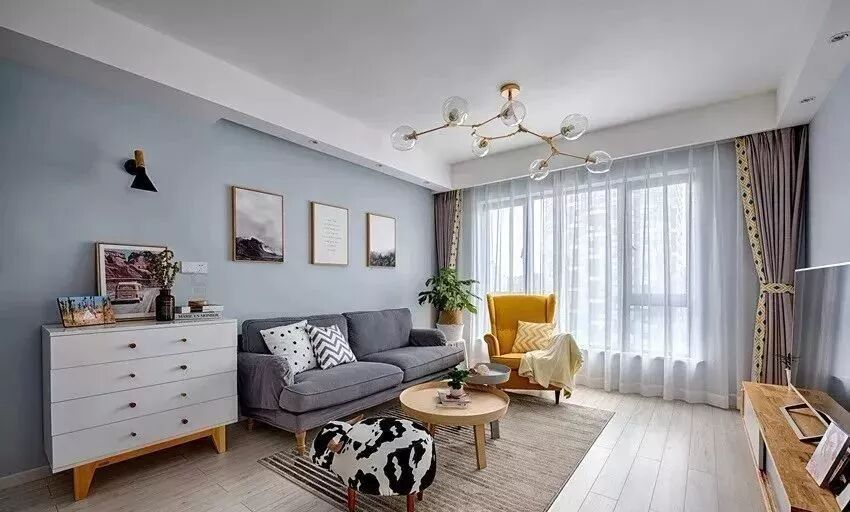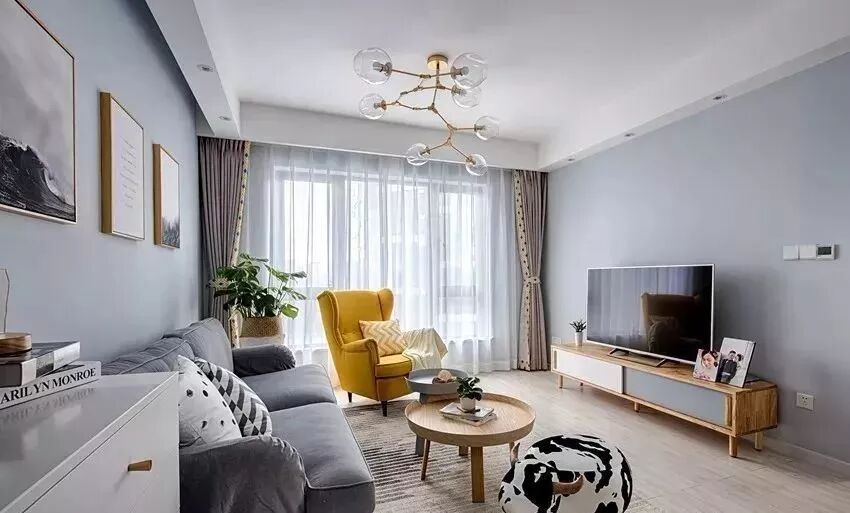▲ 灰色系布艺主沙发、大小尺寸网红茶几、上方背景点缀金框装饰画、与一把明黄色老虎椅,温馨点带着点别致的小个性。