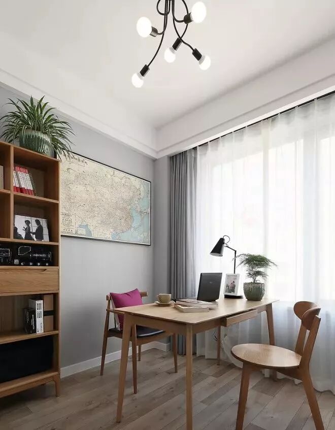 ▲书房纱帘让室内光线变的温和,原木材质桌面,一盆绿植,在阳光下享受慵懒午后。