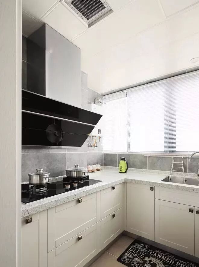 ▲厨房地面铺贴三色六边砖,呼应入户设计,墙面铺贴白色瓷砖,搭配木色系橱柜,简洁明亮又不显单调。