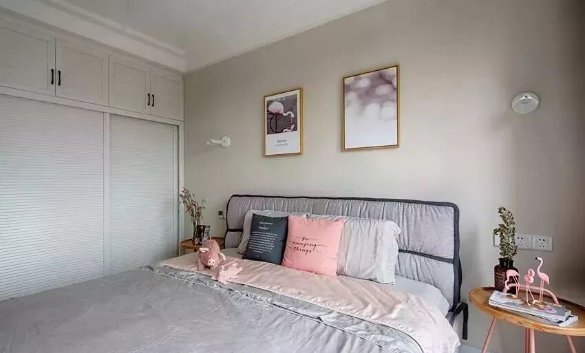 ▲舒适的软靠大床,原木铁件边几,侧墙木作白色百叶移门大衣柜,高颜值就寝空间。装饰画、床品、以及窗帘,空间中点缀粉粉少女色系,大受女主喜爱。