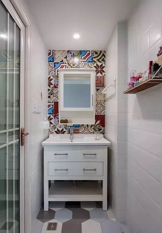 ▲卫生间干湿分离,提高使用效率,呼应整体配色的六边砖,搭配色彩丰富的花砖背景,花纹与配饰间色彩的呼应,巧妙地避免了视觉上的凌乱感。