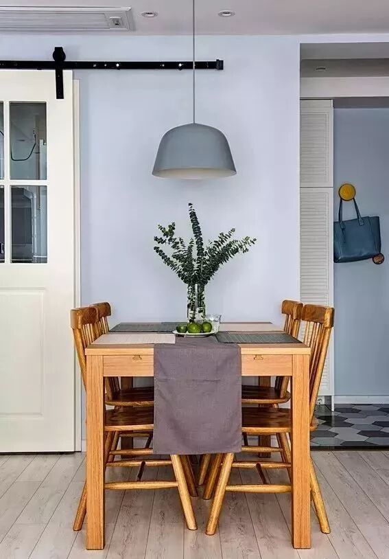 ▲餐厅与客厅互通,整体色调延续公共领域空间搭配,原木风的餐桌椅搭配简约灰色系吊灯,简单的餐桌布置出清新就餐氛围。