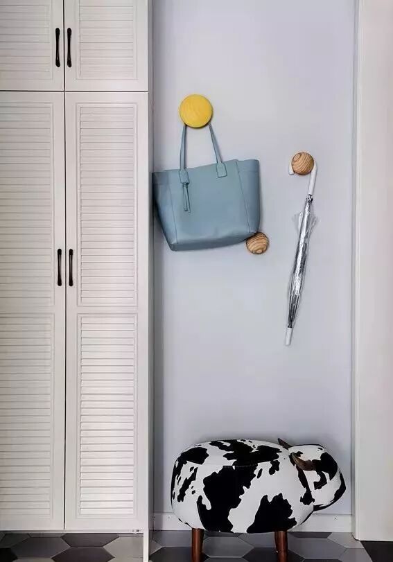 ▲ 入户玄关木作60公分深的厚柜子,除了能够收纳不常穿的鞋子,还能收纳行李箱等杂物,钮扣衣帽钩与小牛换鞋凳增添空间趣味性。简单的几何纹理瓷砖拼接,打造出落落大方的玄关空间。