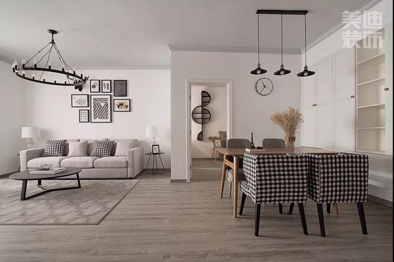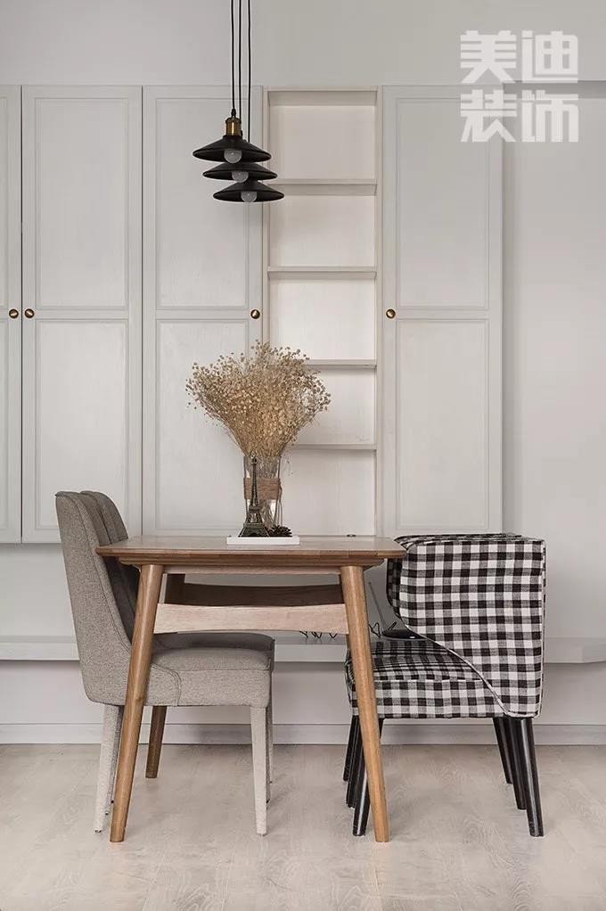 ▲实木智能整装·餐厅丨整体基调是浅灰色,让人平静放松,搭配原木餐桌、小格子椅子完美的融入整体空间基调,冷暖结合,优雅不失个性。