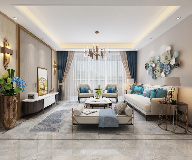 客厅的装饰主要采用美式效果的为基调,地板主要采用灰色瓷砖,和地毯的部分相呼应,增加了业主的品味和档次。整体以米色和蓝色为主,温暖而不失冷冽!