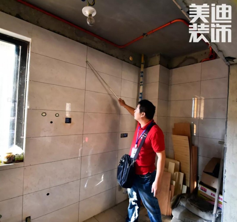 △ 仔细测量地面的水平度,从各个角度对在施工地进行严格检查,力求打造美迪装饰完美工地。