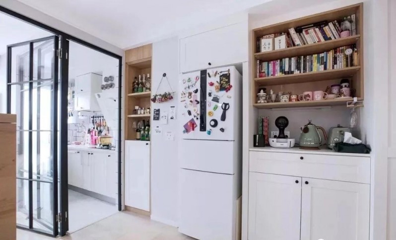 木作系统柜,内嵌冰箱,两侧规划多层置物搁板,无论是书籍、摆设瓶罐,都有地方放了。