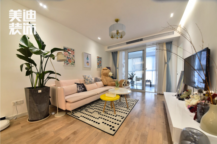 客厅整体色调温馨,局部亮色更是突出了整体的风格,合适的软搭让人住起来更舒服